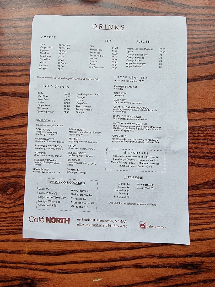 Welcome to Cafe North, Manchester's culinary gem located at 66 Shudehill. This charming café offers a delightful menu that caters to a variety of tastes, from hearty breakfasts to refreshing drinks.